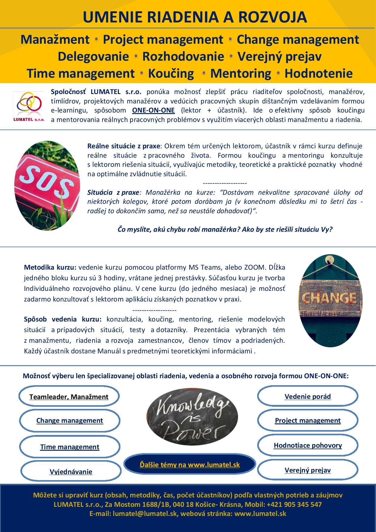 V prípade záujmu o ďalšie kurzy realizovaných formou ON-LINE, OSOBNÁ ÚČASŤ (viď sekcie Manažment, Obchod a nákup, Osobnostný rozvoj, Odborné kurzy), prosím vyplňte "Rezerváciu účasti", ktorá je uvedená pri každom kurze, prípadne pomocou tohto "Kontaktného formulára" požiadajte o ďalšie informácie. Vopred ďakujeme.