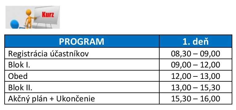 CENA: 120,00.-eur bez DPH/ os./ Trvanie kurzu: 3 hodiny +Follow up ( konzultácie zadarmo do 30 dní od realizácie kurzu)